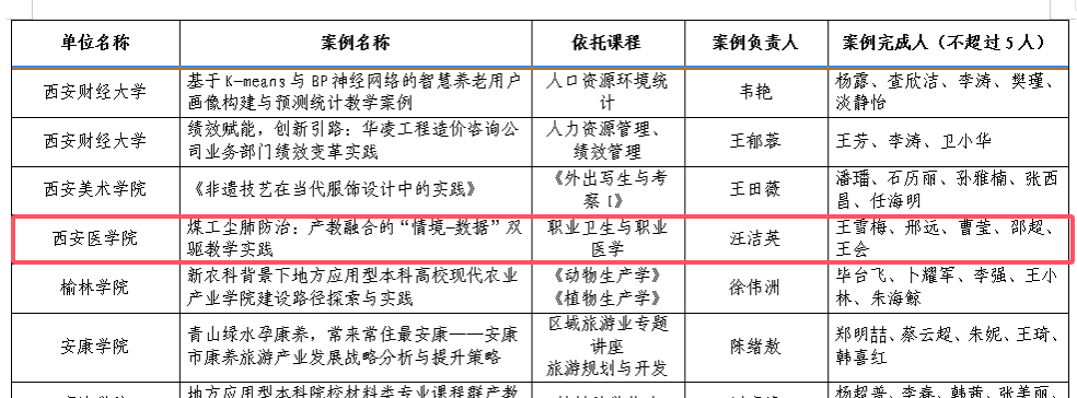 近日,陕西省教育厅公布2025年本科教学案例遴选结果,汪洁英老师及《职业卫生与职业医学》教学团队编写的 “煤工尘肺防治:产教融合的‘情境-数据’双驱教学实践”案例成功入选产教融合类省级教学案例。
